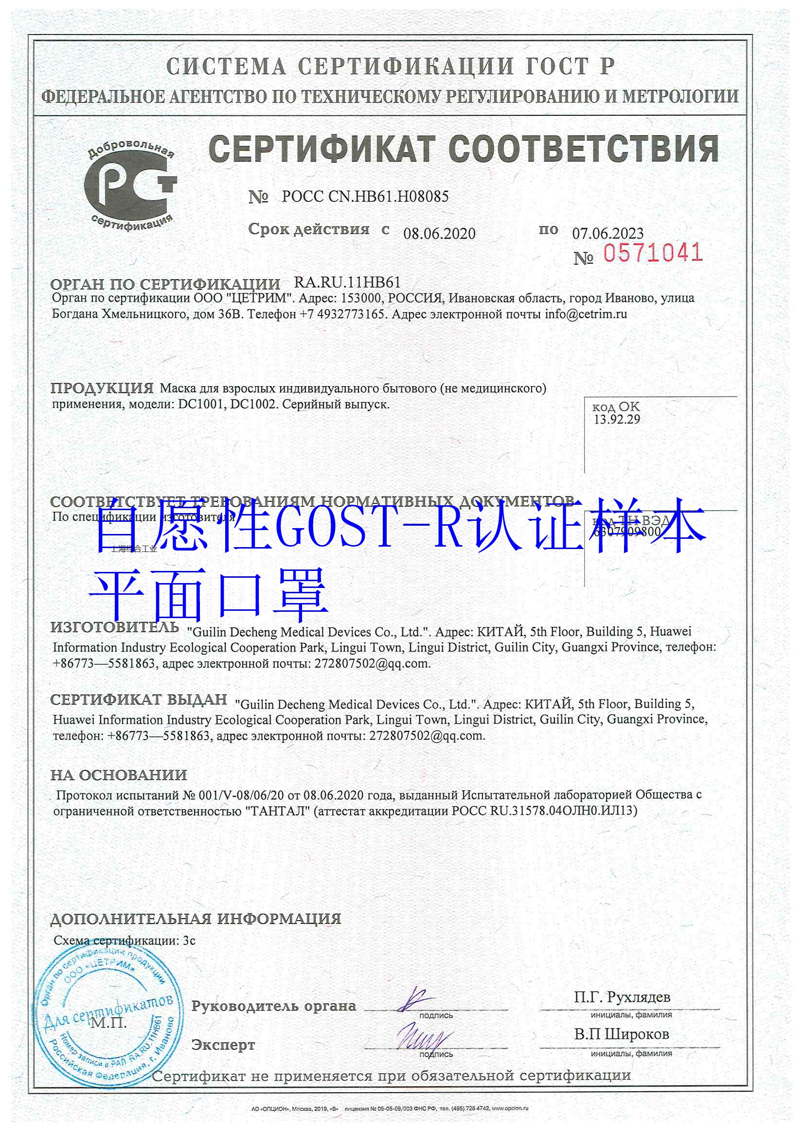 方案二、自愿性GOST-R证书:名称:一次性平面口罩(非医用)自愿性GOST-R证书证明产品不在EAC强制性范围的,并且产品质量符合了俄罗斯GOST标准的要求是合格的。时间3-5天。(证书俄罗斯政府同一个的格式,不支持网络查询) 要求文件:申请表,说明书,GB321610报告,照片 有效期3年 |